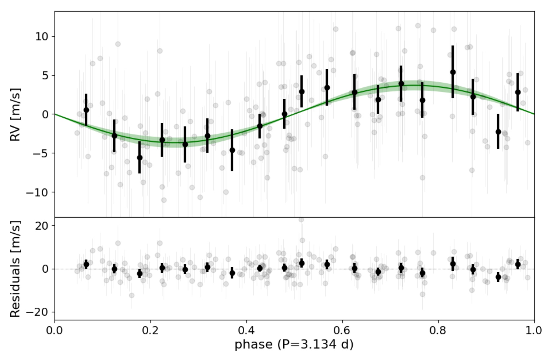 Courbe de vitesse radiale de TOI-1695 détectée par SPIRou et modèle de l’orbite de l’étoile dû à l’exoplanète.