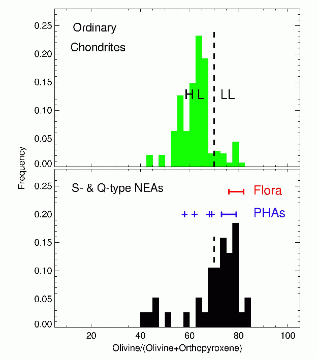 Il apparaît que les météorites (OCs) et les NEAs (types S et Q) n’ont pas la même distribution compositionnelle (voir le rapport oliv/(oliv+opx) dans la Fig. 1). En particulier, la plupart des NEAs ( 2/3) ont une composition semblable aux météorites LL mais ces météorites ne représentent que 8% des chutes (10% des OCs) ! Ceci implique que les NEAs que nous observons télescopiquement (taille comprise entre 300 m et 10 km) ne sont pas les corps parents directs des météorites (taille comprise entre qq. cm et qq. m) ; météorites et NEAs proviennent donc directement de la ceinture principale mais de régions différentes au sein de cette dernière.