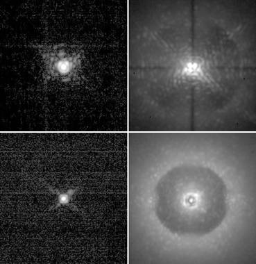 Images of a star obtained without (left) and with the coronagraph (right) for two coronagraphs, the HWQ4PM manufactured LESIA (top) and apodized Lyot mask made ​​OCA (APLC, bottom). These coronographic images are consistent with the predictions.