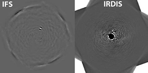 Images obtained with two instruments of SPHERE, the infrared spectrograph, IFS and the infrared camera, IRDIS. The companion is a low mass star of 9 magnitudes lower than the star and located at a separation of 0.24 arcsec.