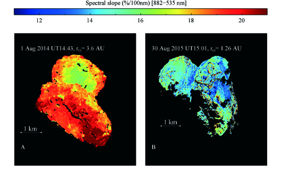 Changement de couleur, en terme de pente spectrale de la surface du noyau cométaire entre des observations espacé d’un an. A gauche des observations obtenues en août 2014, à une distance du Soleil de 3.6 unités astronomique, à droite celle obtenues en août 2015, juste après le passage au périhélie de la comète 67P.