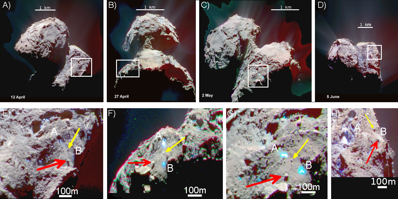 L’étude de Filacchione et al., 2016 porte sur la détection en mars 2015 de la glace carbonique – jamais observée sur une comète précédemment sur la région Anhur, notamment dans la région nommée A en Figure 2 où OSIRIS a observé un mois après une région brillante enrichie en glace d’eau.