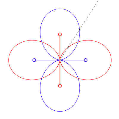 Sur la figure suivante, on a schématisé deux antennes (en rouge et en bleu) avec leurs diagrammes de réception respectifs. La ligne pointillée indique la direction d’arrivée d’une onde. Les deux petites croix marquent l’intersection de cette direction d’arrivée avec les diagrammes de réception, qui, rappelons-le, caractérise le gain de l’une antenne en fonction de la direction. Dans notre exemple, où on fait l’hypothèse d’une onde sans polarisation, la contribution mesurée par l’antenne rouge sera environ deux fois plus petite que celle mesurée par l’antenne bleue. C’est le quotient entre ces deux mesures qui donnera l’information de direction d’arrivée. La précision sur la mesure et celle de l’étalonnage fixera directement celle de la détermination de la direction d’arrivée.