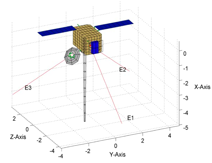 La sonde STEREO-A et ses antennes électriques (notées E1, E2 et E3) a été modélisée pour l’étalonnage de la réponse des antennes.