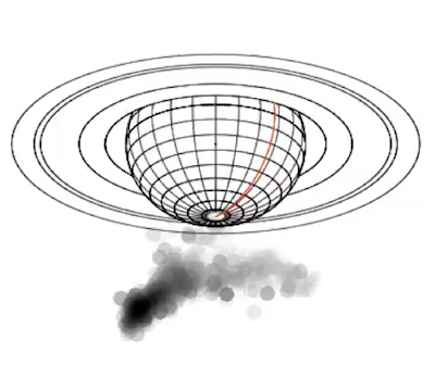 L’analyse goniopolarimétrique permet de reconstruire a posteriori (c’est-à-dire au sol, et non à bord de la sonde) la direction d’arrivée, la polarisation et le flux de l’onde observée à chaque instant et à chaque fréquence. Ci-dessus, un exemple de carte de directions d’arrivée des ondes radio vue depuis Cassini, avec la planète Saturne représentée en arrière plan.