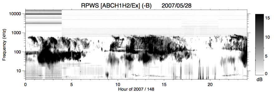 L’intensité du signal mesuré en fonction du temps et de la fréquence est codé en niveaux de gris. Les gros blocs noirs situés entre 10 et 1000 kHz sont le SKR (Saturn Kilometric Radiation) : rayonnement kilométrique auroral de Saturne, émis dans les régions polaires de Saturne, conjointement aux aurores de cette planète.