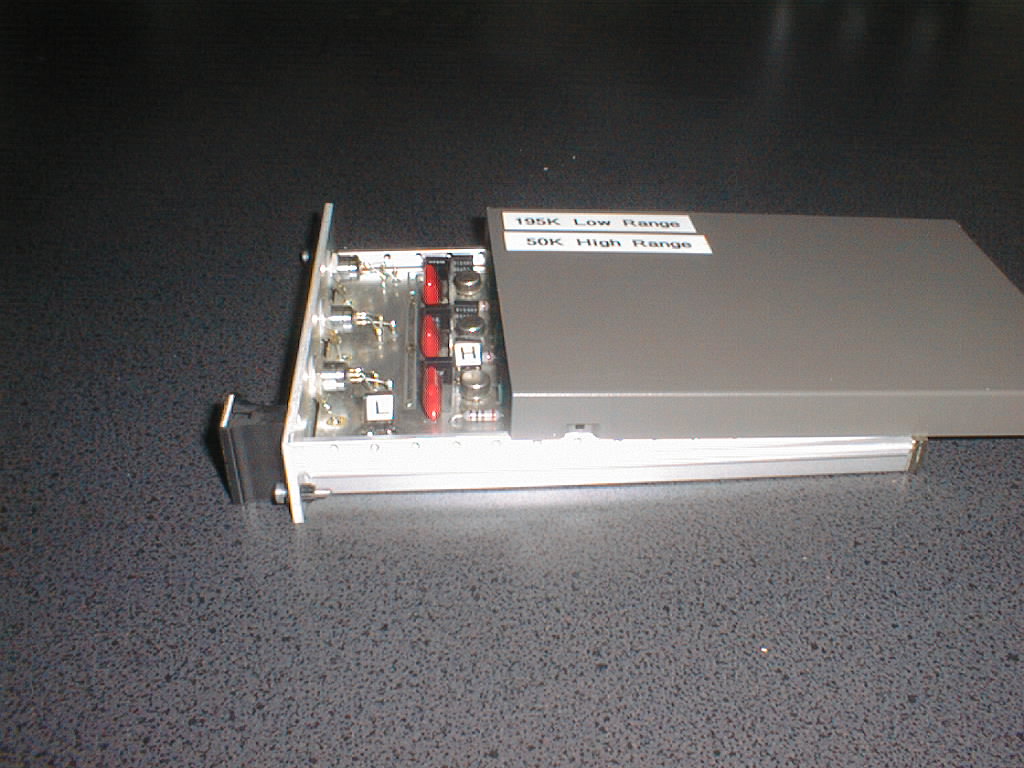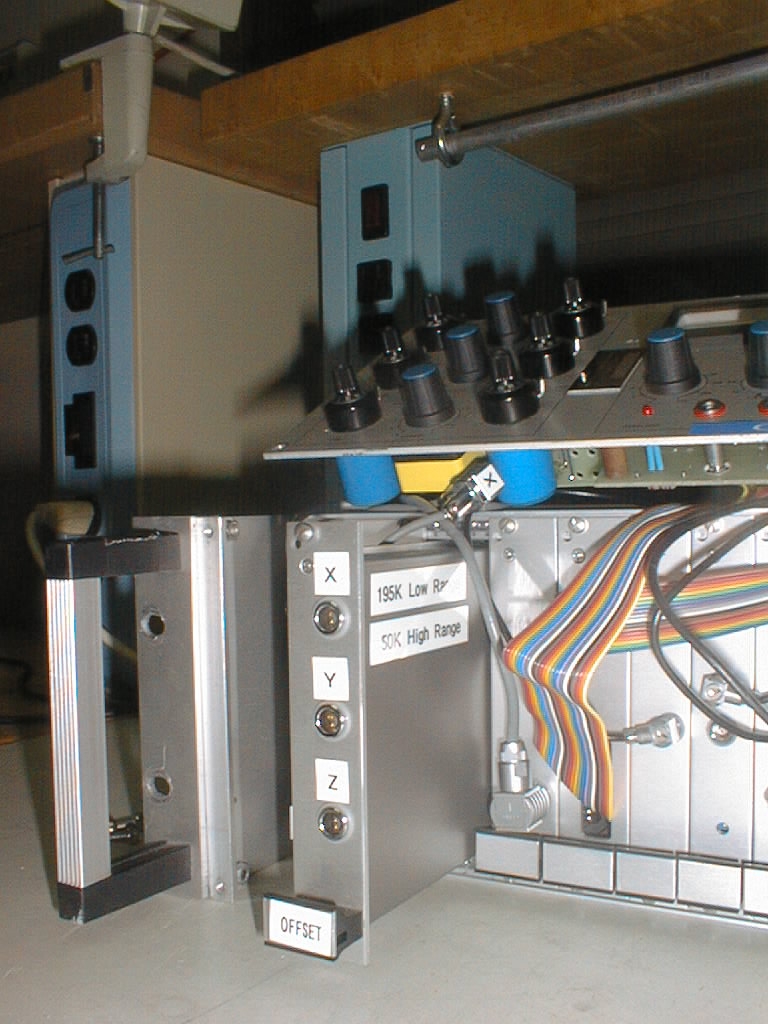 In practice, the offset controler board has been modified to have the two resistors (195k and 50k) always fixed on it. One is fixed on a non-connected location, the other on a connected location. Then, to change the scanning range, one has simply to exchange the resistors on their plugging locations (see photos below). For GriF, the "high range" 50k resistor must be connected.