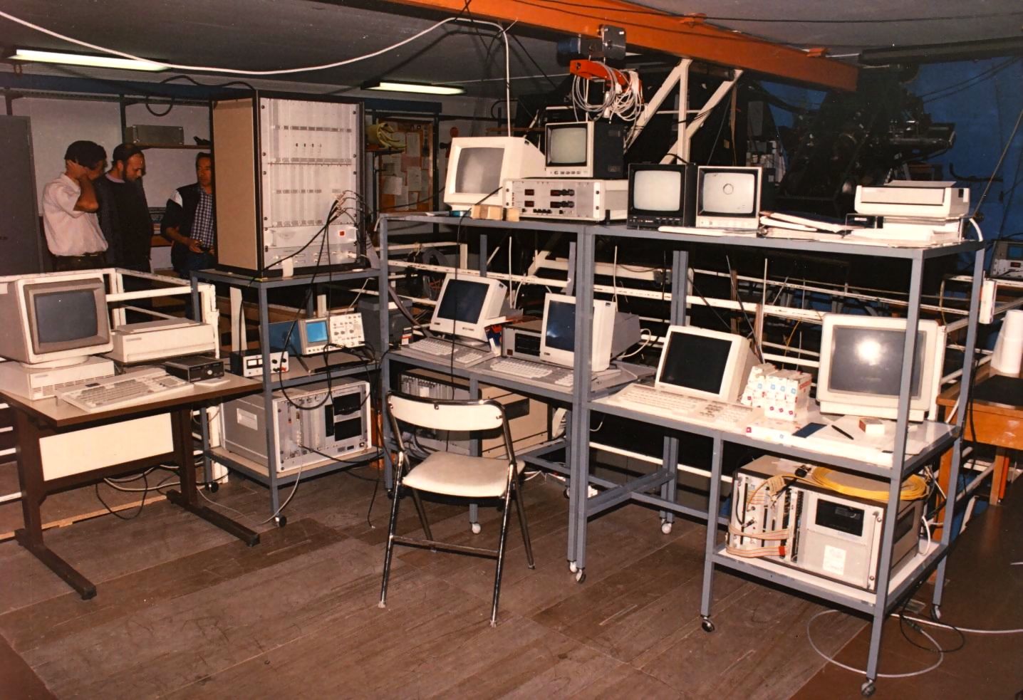 On voit sur les images ci-dessus le prototype COMEON en labo Ă gauche, et installĂ© au foyer CoudĂ© du 1m52 de l’OHP (Obs. Haute Provence). Ci-contre, la salle de contrĂ´le et ses 6 claviers pour contrĂ´ler l’ensemble de l’expĂ©rience. Notez le grand rack vertical Ă gauche de l’image qui est le calculateur temps rĂ©el analogique qui calculait les centres de gravitĂ© des spots.