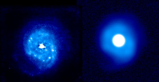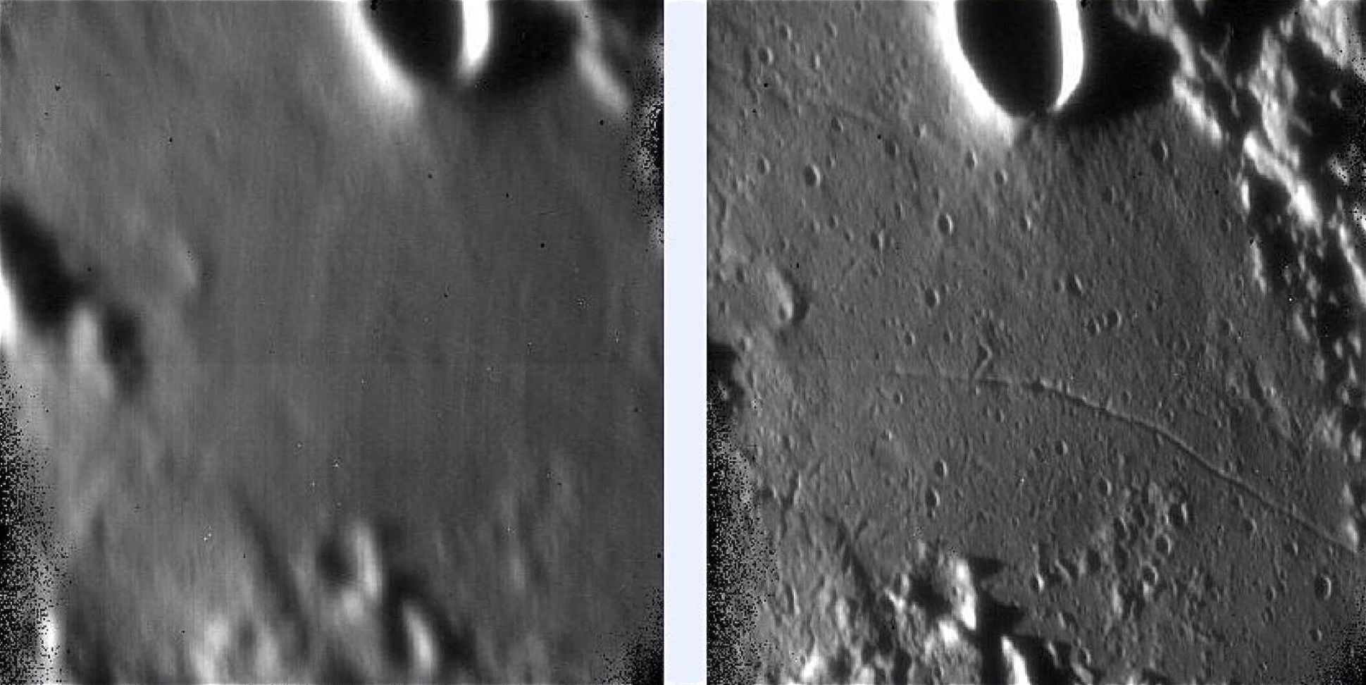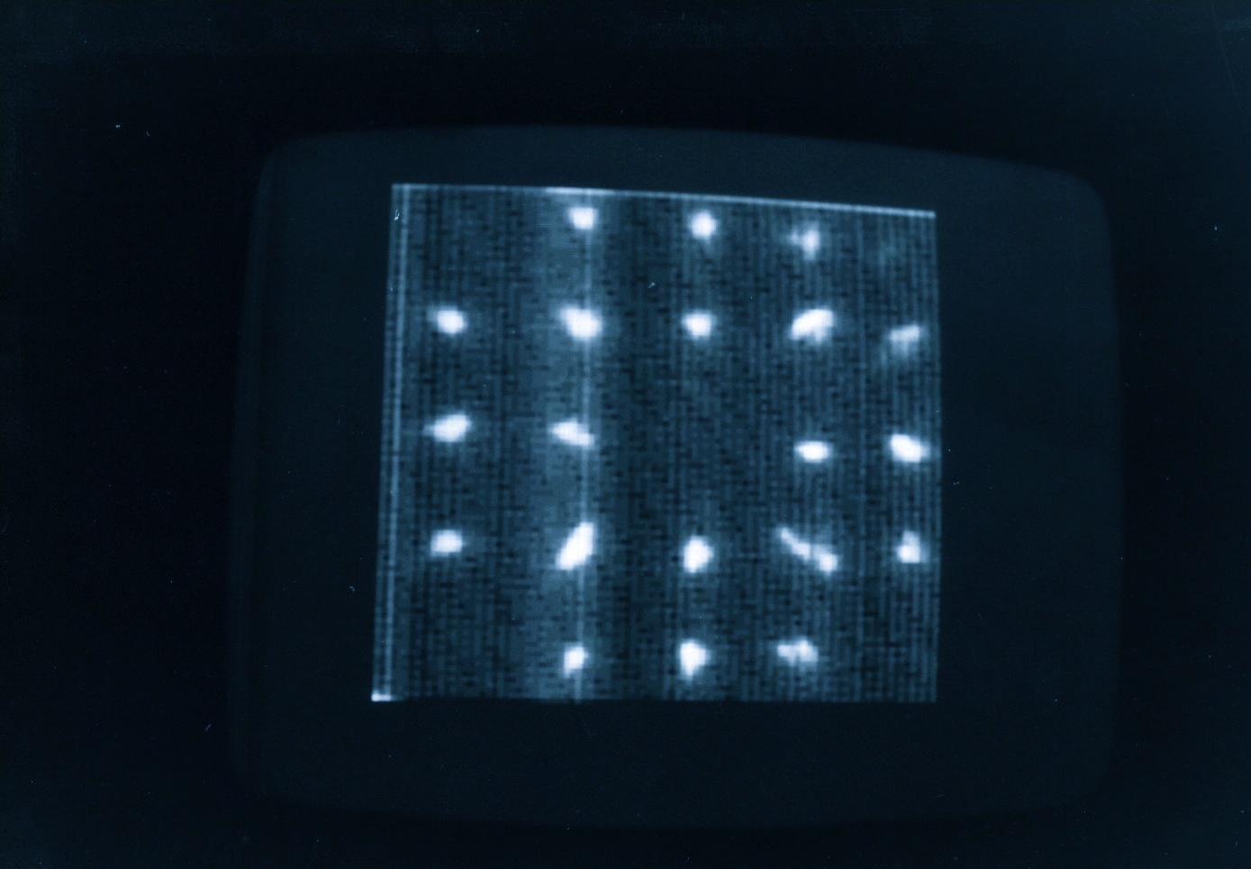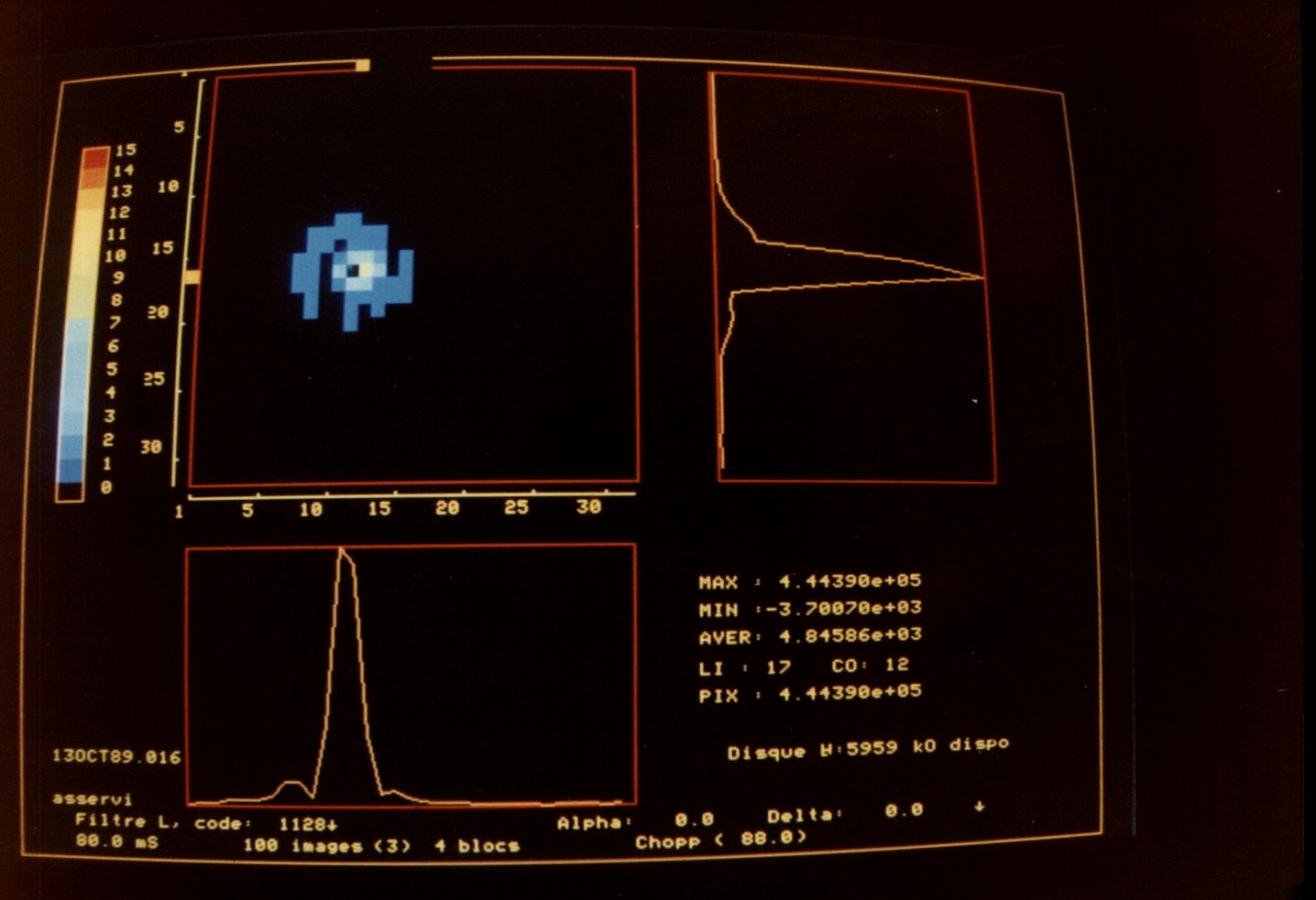 Ci-contre Ă gauche une photographie de l’Ă©cran de la camĂ©ra IR (cible 32x32) le 13 octobre 1989, prise en bande L (à λ=3.5µm) et la photographie de l’Ă©cran vidĂ©o du Shack-Hartmann de COME-ON au-dessus, alors Ă 5x5 sous-pupilles. Ces deux images ont Ă©tĂ© prises Ă l’Observatoire de Haute Provence.