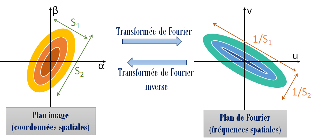 Considérons une image dont l’intensité dépend des coordonnées spatiales angulaires (α,β). On peut lui associer des coordonnées de fréquence spatiale (u,v) qui sont les variables conjuguées des coordonnées angulaires spatiales par la transformée de Fourier.