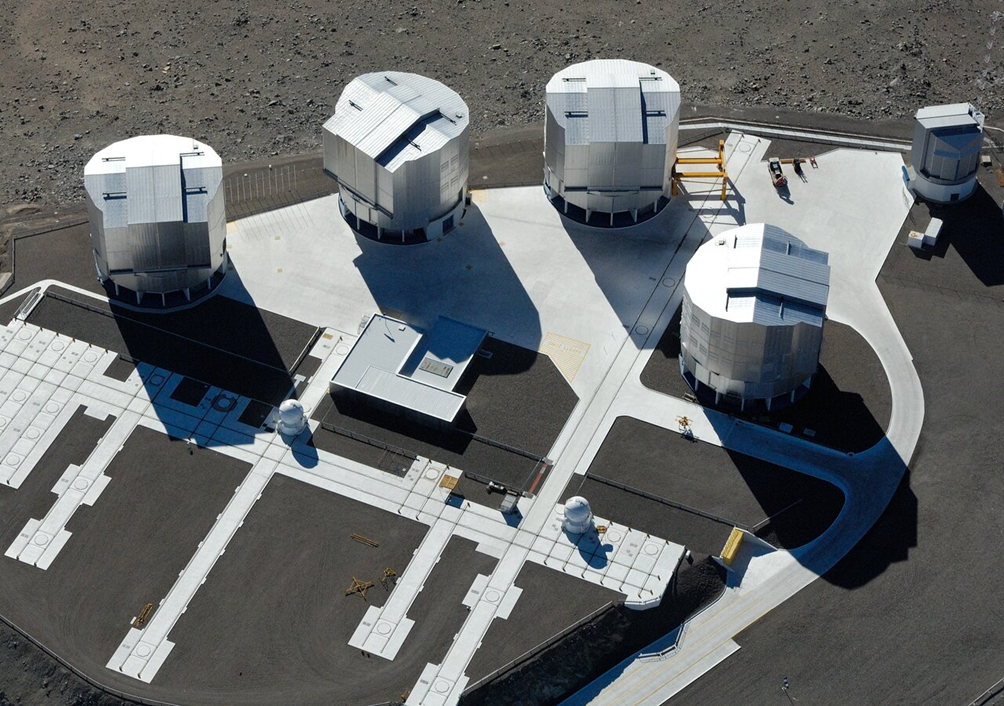 Les 4 télescopes du VLT, utilisés par l’instrument GRAVITY. C’est en utilisant ces 4 télescopes, simultanément, que GRAVITY a pu observer les étoiles orbitant autour de Sgr A*