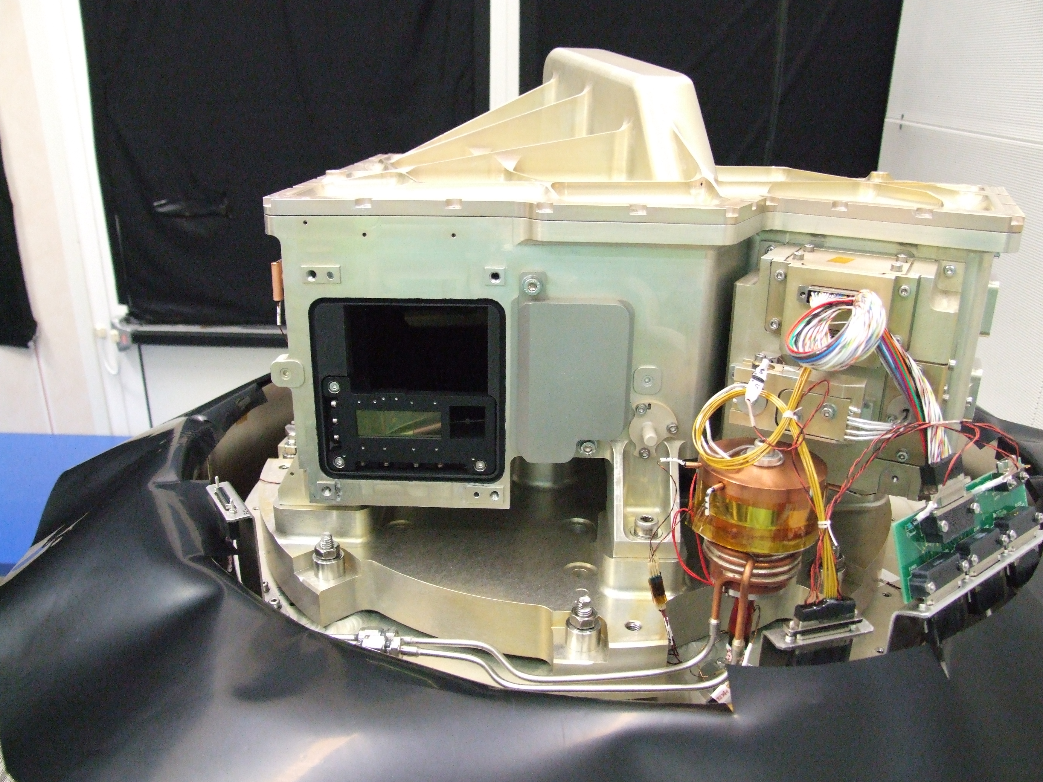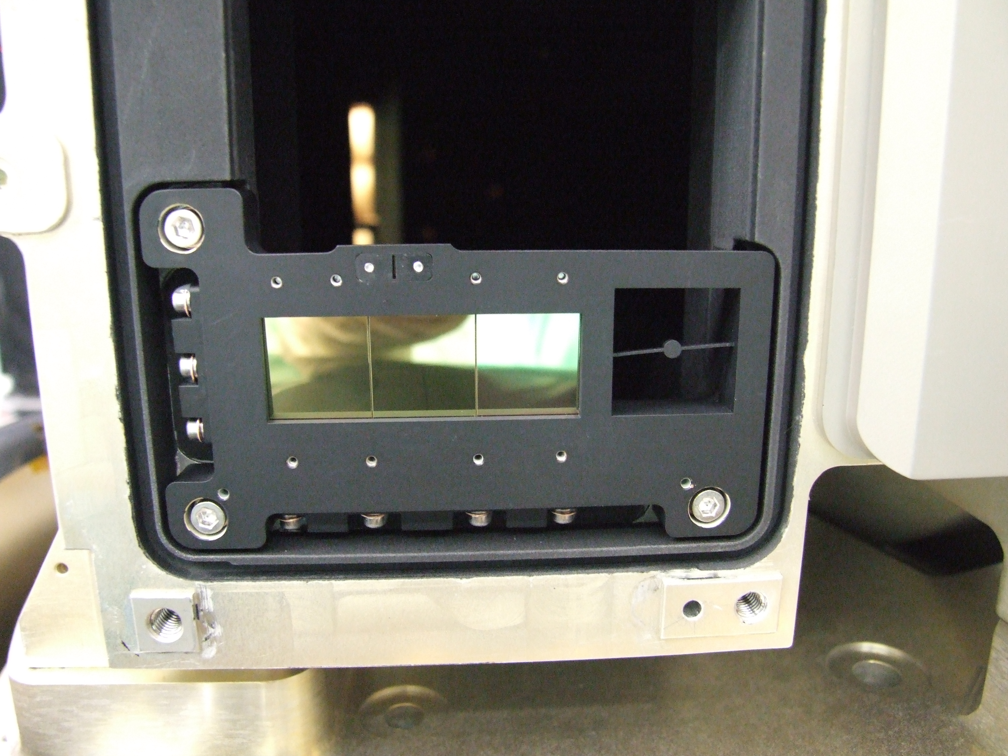 Les coronographes sont visibles à gauche, à proximité de l’entrée optique de l’instrument.