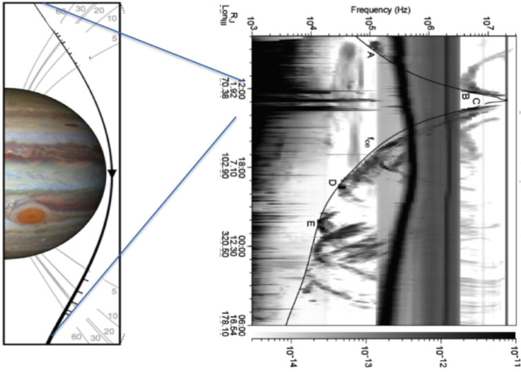 On the right diagram (from Kurth et al., GRL, 2017), the black line is the local electron cyclotron frequency. A, B, C, D and E events correspond to potential radio sources crossing.