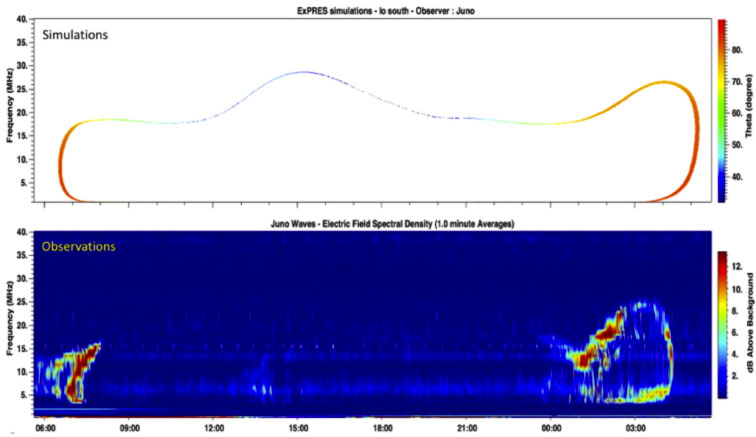 In preparation for Juno’s observations, a simulation code has been developped by the Observatoire de Paris’ team. It is named SERPE (ExPRES in english, for Exoplanetary and Planetary Radio Emissions Simulator), and is based on a theoretical modelling of those emissions (Cyclotron Maser Instability, CMI in the following) as well as on the description of jovian magneto-plasma, in order to predict the dynamic spectra (emissions’ occurence versus time and frequency) detected by an arbitrary observer, moving or at rest, for example Juno.