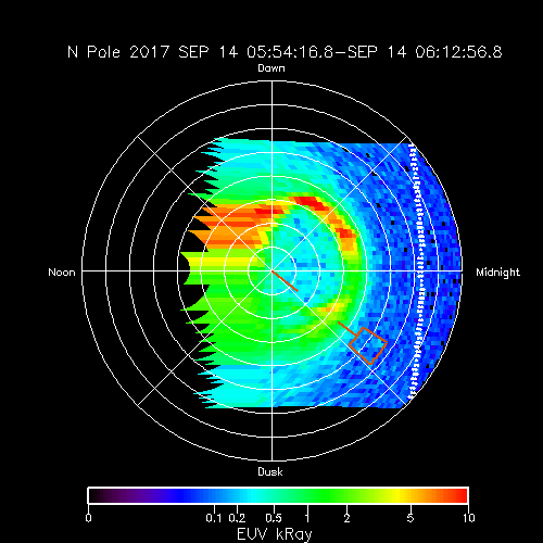 Projection polaire des aurores nord de Saturne (les cercles pleins indiquent des parallèles séparés de 5° de latitude). L’empreinte aurorale d’Encelade est observée par le spectro-imageur UV de la sonde Cassini pendant 3h30, à l’emplacement prédit (boîte) et tournant autour du pôle de manière synchrone avec la lune à l’équateur.