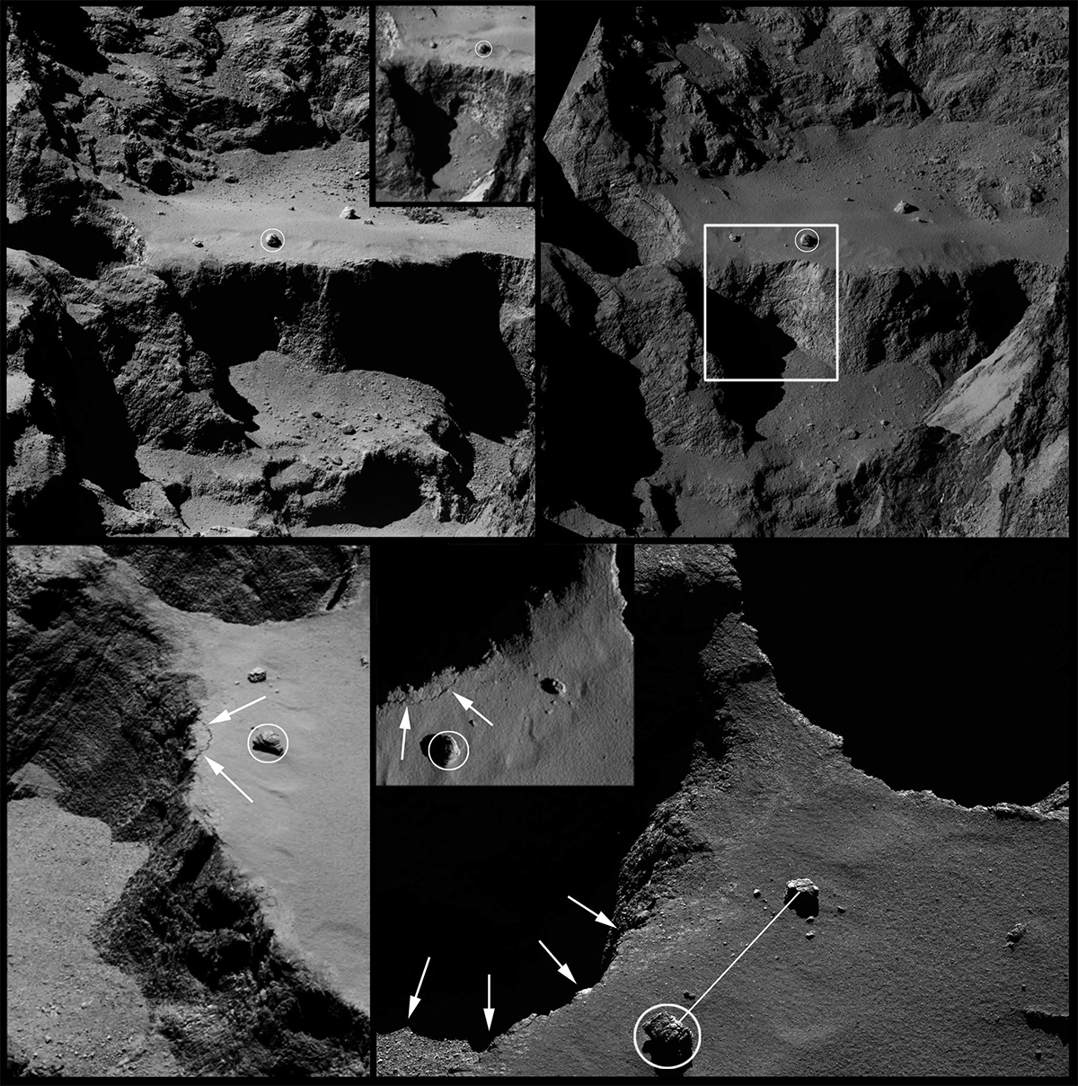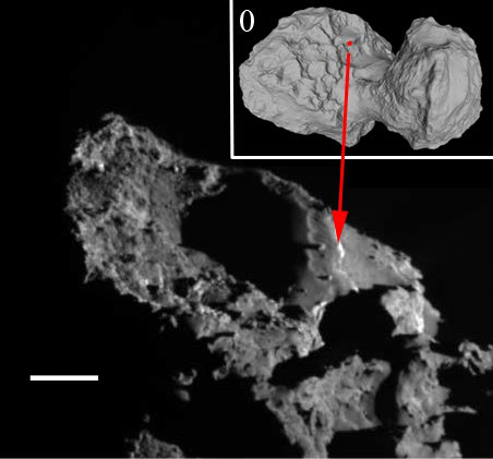 Cinq jours après le sursaut d’activité du 10 juillet 2015, grâce aux images du système d’imagerie OSIRIS, les chercheurs ont repéré une région très brillante et enrichie en glace d’eau fraichement exposée sur la paroi de la falaise de 134 m de haut, là où avant il y avait la fracture.