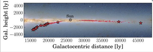 En abscisse la distance au centre galactique, et en ordonnées la hauteur au dessus du plan galactique, exprimées en années lumière. Les géantes rouges observées par CoRoGEE apparaissent en rouge ; celles dont la composition chimique ne suit pas l’horloge galactique sont représentées par des symboles surlignés en noir.