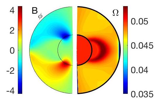 Les résultats de ces simulations font apparaître le développement d’une région dite de super-rotation, c’est-à-dire d’une région où le plasma dépasse la vitesse angulaire imposée aux limites de la région simulée (région lunulée dans la figure illustrative). Dans les simulations et les expériences menées en laboratoire ne prenant pas en compte la stratification du milieu, la super-rotation est un phénomène qui tend à diminuer en importance dans le régime de rotation globale rapide (correspondant aux contextes stellaire et planétaire). Nos résultats montrent, en revanche, que la stratification stable du milieu redonne une amplitude significative à ce phénomène, même dans ce régime.