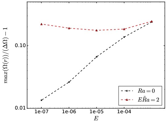 Amplitude de la super-rotation relativement à la rotation différentielle imposée entre les sphères interne et externe, en fonction du nombre d’Ekman (E << 1 correspond au régime magné- tostrophique). La prise en compte de la stratification du milieu (courbe rouge) redonne son importance à un phénomène qui tend à disparaître dans un milieu non stratifié (courbe noire).