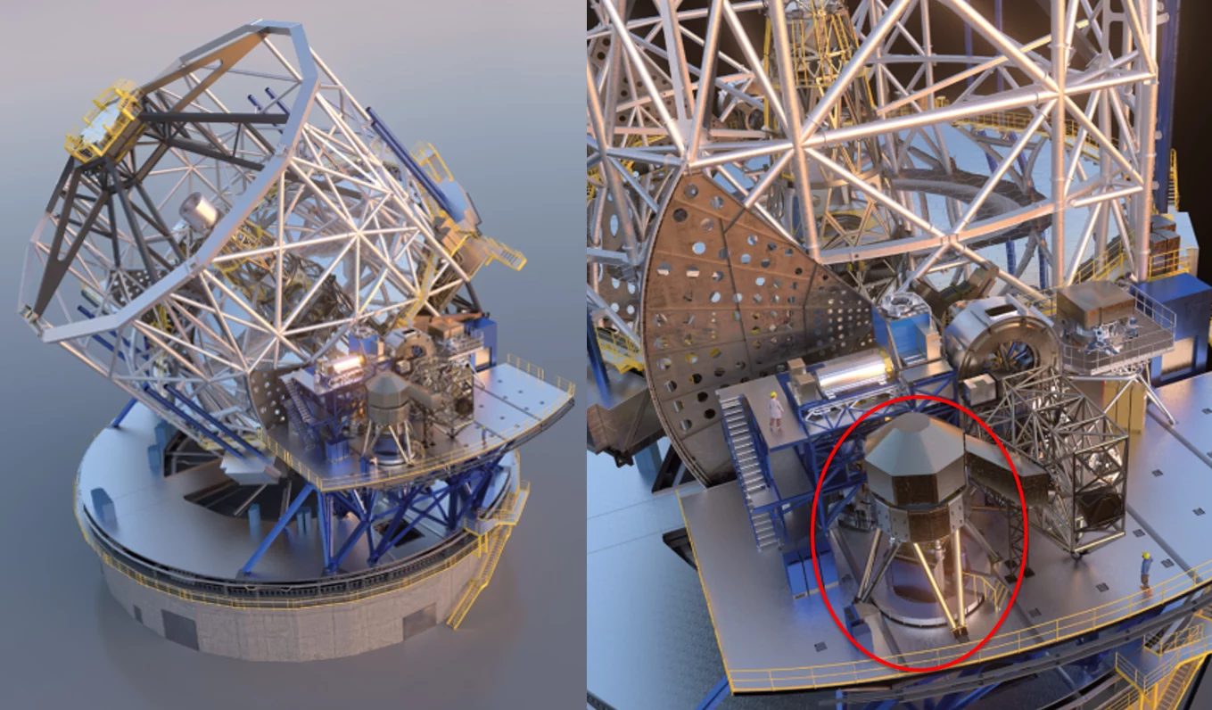 Ă€ gauche, vue d’ensemble de l’ELT avec ses instruments de première lumière (MICADO, MORFEO, HARMONI, METIS) sur une des deux plateformes Nasmyth. Ă€ droite, vue rapprochĂ©e sur les instruments et plus particulièrement MICADO, encerclĂ© en rouge.