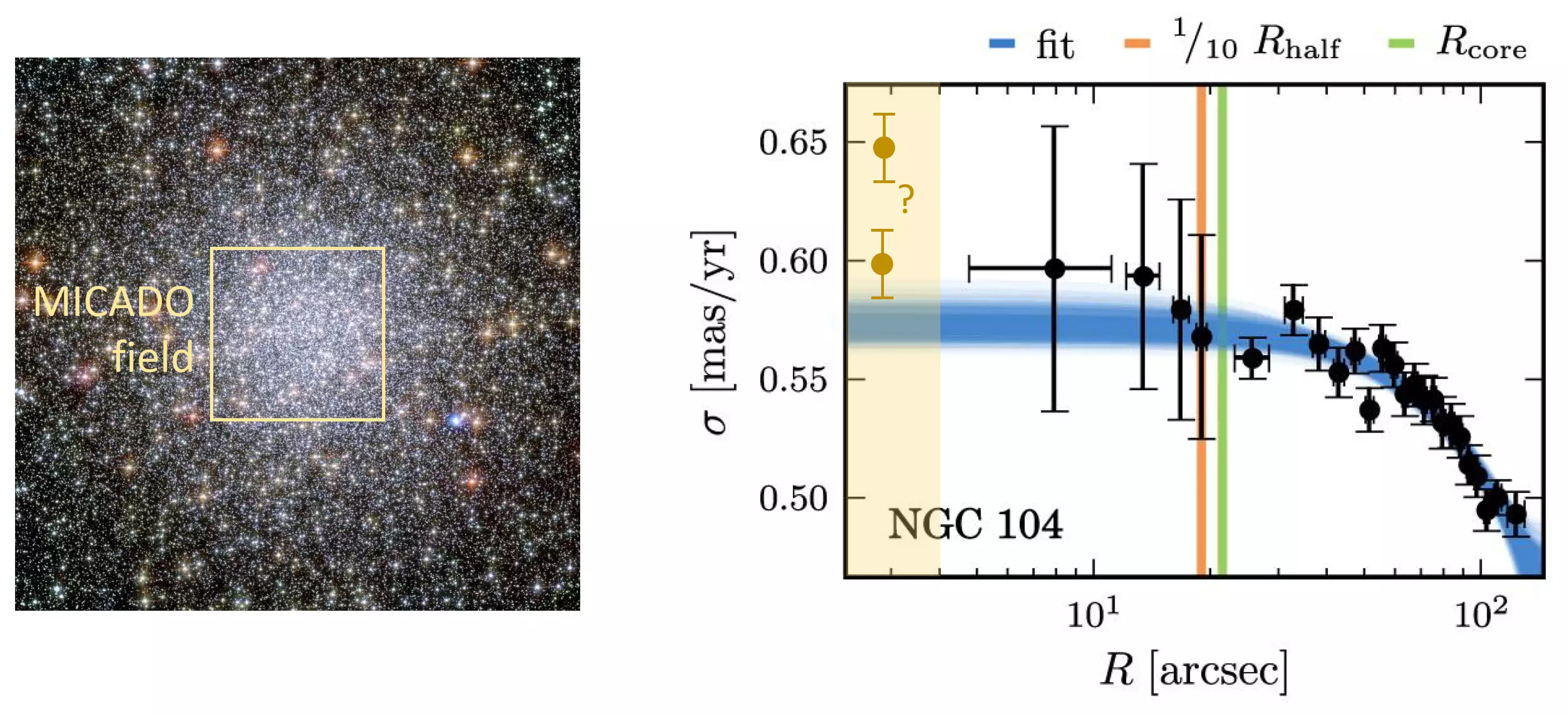 Ă€ gauche : image de l’amas d’Ă©toiles 47 Tucanae avec l’indication du champ de vue de MICADO. Ă€ droite, dispersion de vitesse des Ă©toiles en fonction de la distance au centre de l’amas, montrant que les mesures actuelles sont limitĂ©es par la densitĂ© d’Ă©toiles croissante vers ce centre. MICADO obtiendra des mesures bien meilleures au centre et permettra d’y rĂ©vĂ©ler la prĂ©sence ou pas d’un trou noir massif.