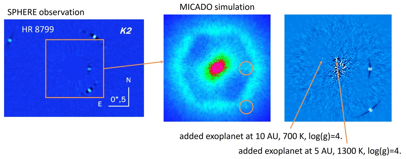 Ă€ gauche, image obtenue avec SPHERE en 2h d’observations du système HR 8799, avec ses quatre planètes connues. Au centre, simulation d’observation MICADO du mĂŞme système rĂ©vĂ©lant les deux planètes internes en 30 s d’observations. Ă€ droite, dĂ©monstration des capacitĂ©s de dĂ©tection par MICADO d’exoplanètes artificiellement rajoutĂ©es.