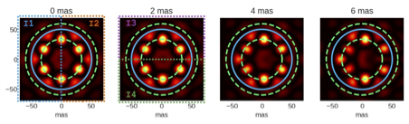Images coronographiques obtenues Ă 2,145 ÎĽm avec l’un des coronographes en plan focal avec, de gauche Ă droite, des erreurs de centrage croissant de 0 Ă 6 mas. Le cercle bleu figure la limite du masque coronographique (50 mas de rayon), les cercles verts externes figurent la couronne utilisĂ©e par STARLOC pour analyser le flux et estimer le dĂ©centrement de l’image, les rectangles I1, I2, I3, I4 sont les zones utilisĂ©es pour calculer les diffĂ©rences d’intensitĂ© horizontalement (I2-I1) et verticalement (I3-I4).
