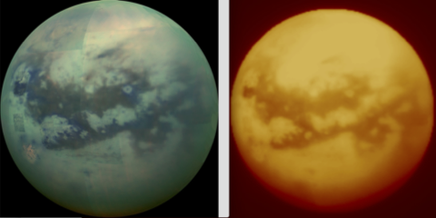 Ă€ gauche, image composite de Titan obtenue par l’instrument VIMS de la sonde Cassini. Ă€ droite, simulation d’observations par MICADO en bande K.