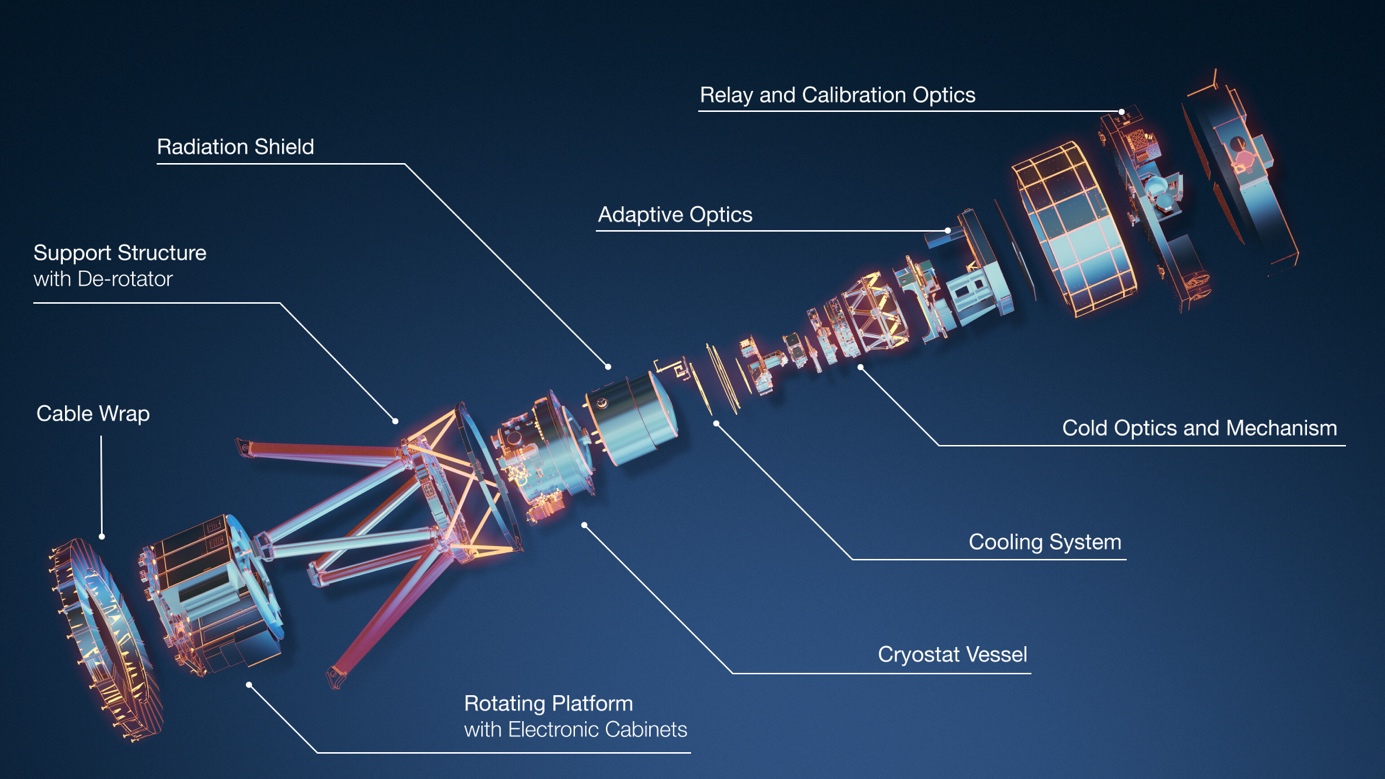 Pour y parvenir dans l’environnement ELT, MICADO interceptera la lumière du télescope avec un relais optique, de sorte que la lumière du télescope puisse être relayée à la fois dans le cryostat de l’instrument et vers le système d’optique adaptative qui corrige des effets délétères de la turbulence atmosphérique. C’est dans ce cryostat que l’optique et les détecteurs sont maintenus au froid afin qu’ils puissent fonctionner efficacement aux longueurs d’onde du proche infrarouge sans interférence avec d’autres sources de chaleur.