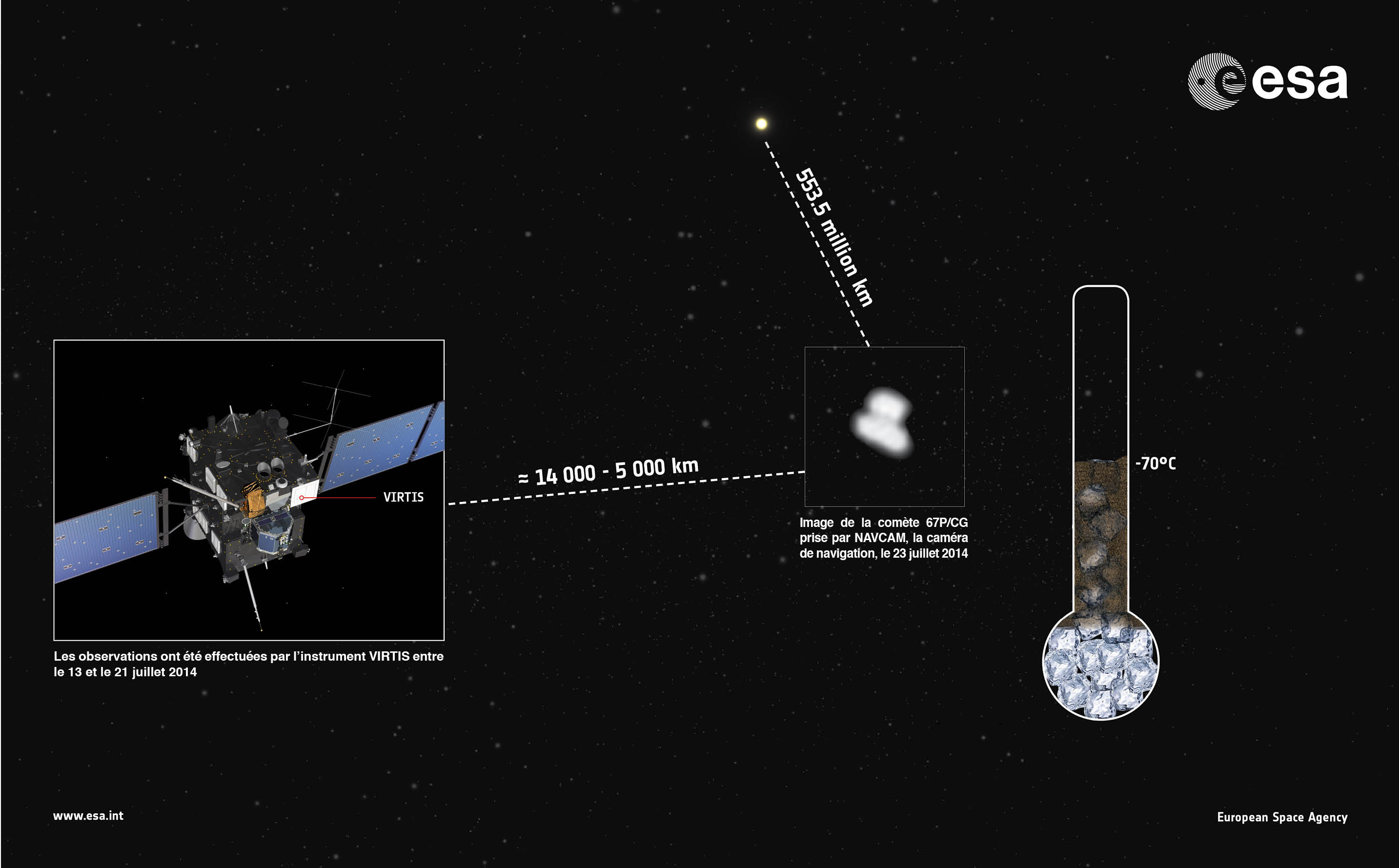Les premières mesures de l’intrument VIRTIS révèlent une température de -70°C, suggérant que la surface de la comète 67P/Churyumov-Gerasimenko est majoritairement couverte de poussière.