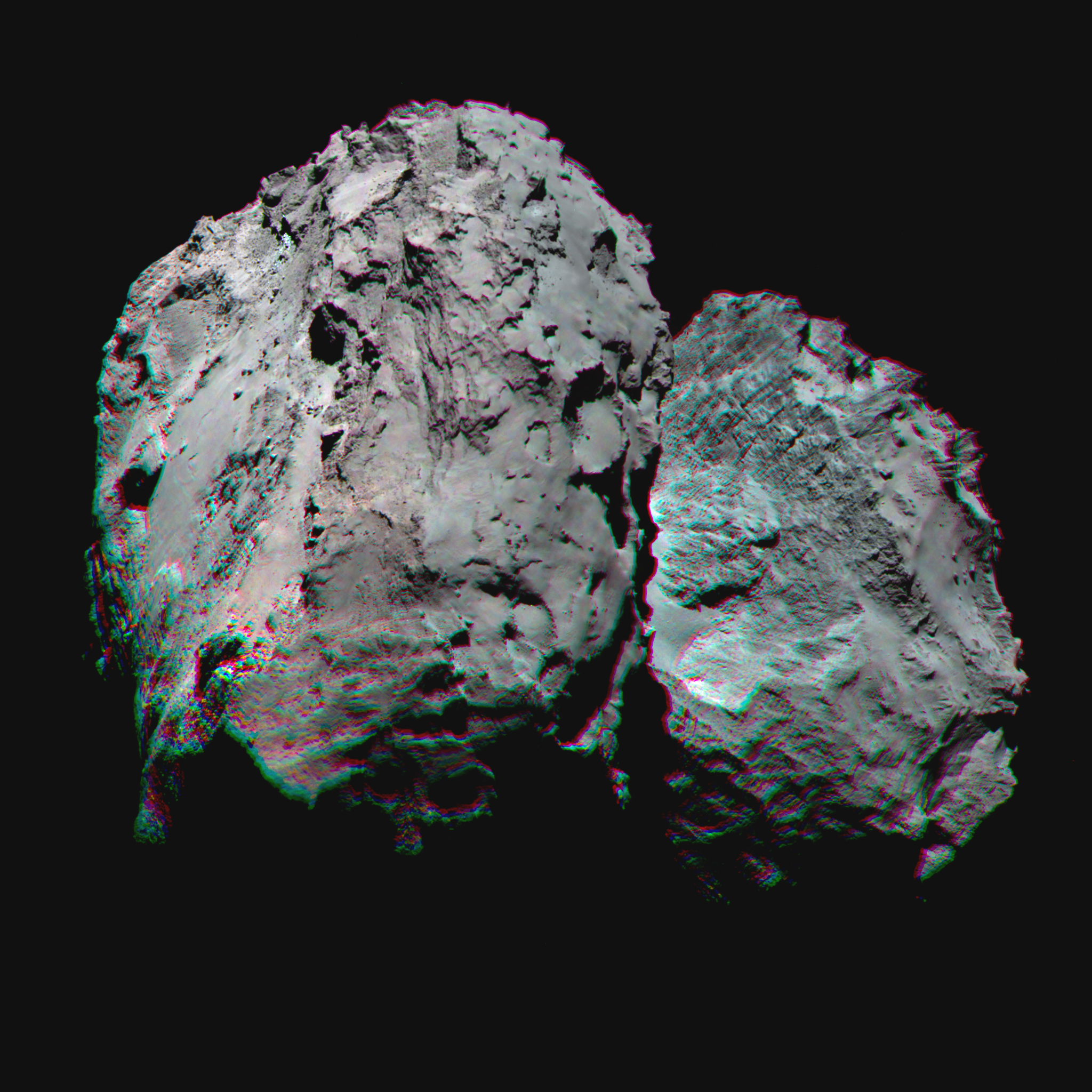 Image en fausses couleurs du noyau de la comète 67P générée avec 3 images prises par la camera NAC/OSIRIS, avec les filtres centrés à 882 nm, 649 nm, et 480 nm. La sonde Rosetta était à 110 km de distance de la comète et la résolution spatiale de 2,1 m/pixel