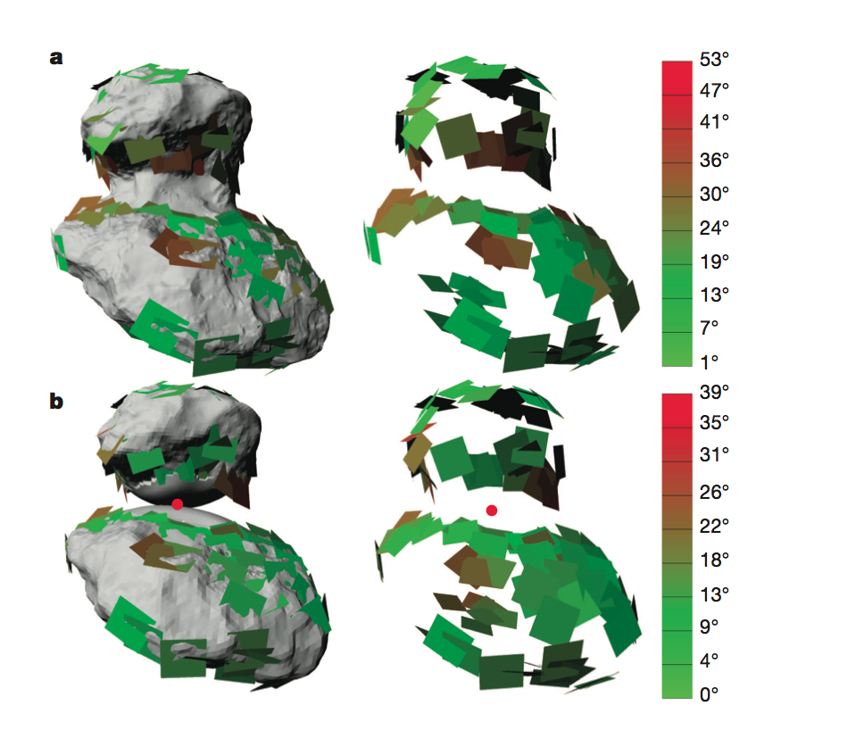 Vues 3D du noyau et de strates de la comète 67P/Churyumov-Gerasimenko : (a) noyau par entier ; (b) lobes séparés. Les plans en couleur représentent le meilleur ajustement dérivé de la forme de la comète. Les échelles de couleur indiquent l’écart angulaire entre le vecteur perpendiculaire au plain et le vecteur de la gravité locale calculés pour l’ensemble du corps (a) et les lobes séparés (b). Plus l’angle est petit plus la stratification est perpendiculaire au vecteur de gravité. La meilleur modélisation est montrée dans le cas de deux lobes séparés. Le point rouge en (b) est le point de contact entre les deux lobes.