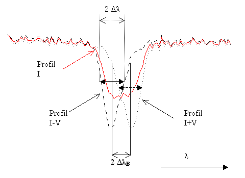 La mesure de l’écartement des composantes Zeeman 2ΔλB permet donc de mesurer les champs magnétiques longitudinaux. Mais comme les composantes sont très peu séparées en intensité, la mesure du décalage Zeeman sera bien plus précise entre les profils de Stokes I+V(λ) et I-V(λ) obtenus en sortie du spectrographe suite à l’analyse polarimétrique, comme le montre la figure ci dessous.