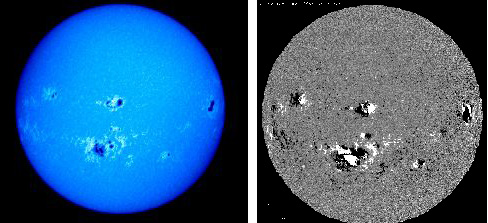 Intensités (à gauche) et champs magnétiques longidudinaux (à droite) mesurés par décalage Zeeman. Les champs magnétiques sortants sont en blanc, et entrants en noir. © Observatoire de Paris et SOHO/MDI-ESA/NASA