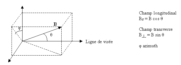 L’effet Zeeman, à condition de mesurer par combinaison linéaire les profils des 4 paramètres de Stokes I(λ), Q(λ), U(λ), V(λ) en fonction de la longueur d’onde sur une raie spectrale bien choisie, permet de remonter au vecteur champ magnétique (à une orientation près). Décomposons le vecteur champ magnétique B de la manière suivante :