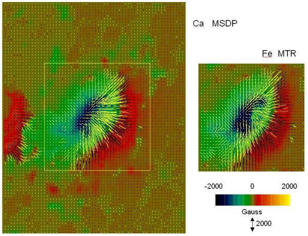 Un exemple de mesure de champ magnétique vectoriel dans une region active obtenue dans la raie CaI 6103 Å (à gauche) et dans la raie FeI 6302 Å (à droite). Les tirets représentent le champ transverse, et les couleurs le champ longitudinal. (© Observatoire de Paris)