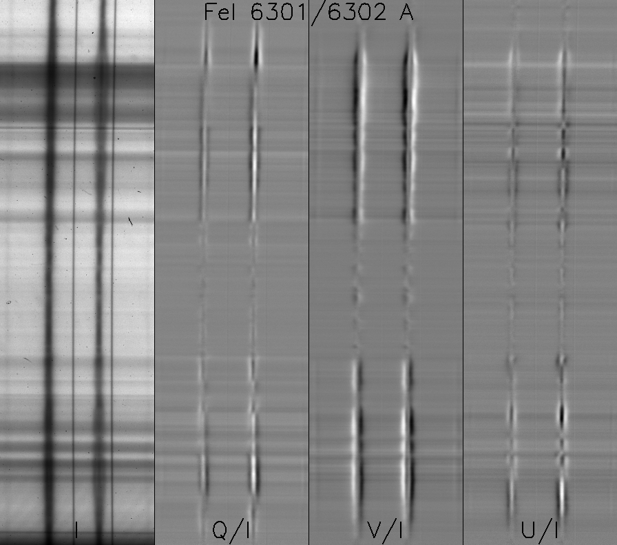I(λ), Q/I(λ), V/I(λ), U/I(λ), dans une région active solaire, raies FeI 6301 et 6302 Å. En abscisse : la longueur d’onde En ordonnée : la direction sur le Soleil (fente du spectrographe). © Observatoire de Paris