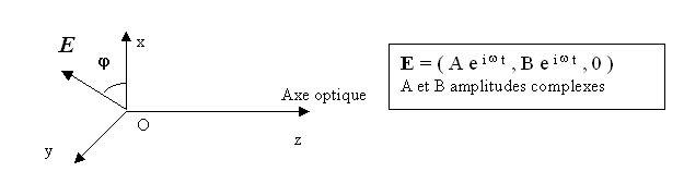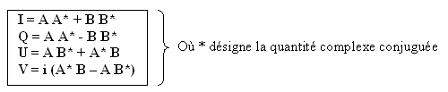 Rappelons que toute onde lumineuse qui se propage dans la direction Oz de la figure est décrite par la vibration d’un champ électrique E dans un plan orthogonal xOy à la direction de propagation Oz. La polarisation de la lumière se décrit par le formalisme des paramètres introduits par Stokes sous la forme d’un vecteur S à quatre composantes. (I, Q, U, V). Décrivons le champ électrique par le vecteur E = ( A e i ωt, B e i ω t, 0 ) où A et B sont des amplitudes complexes, qui portent donc un terme de phase.