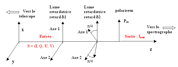 Un polarimètre se compose d’un ou deux retardateurs optiques qui servent à introduire un retard de phase par biréfringence entre deux axes propres bien déterminés, dits lents et rapides. Ces retardateurs sont constitués de cristaux liquides, ou de spath ou encore de quartz. Ils sont suivis d’un dispositif polarisant dont la fonction est de ne laisser passer que la projection de la vibration lumineuse dans une direction particulière, dite direction d’acceptance (on a choisi l’axe Ox sur la figure ci dessous). Avec deux retardateurs variables de 0 à 2π d’azimuth fixe (retard δ1 variable, azimuth 0 et retard δ2 variable, azimuth π/4), il est possible de mesurer le vecteur de Stokes incident S = (I, Q, U, V) en faisant varier (électriquement) les valeurs de δ1 et δ2 :