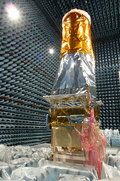 Le télescope CoRoT en cours de tests de compatibilité électromagnétique dans une chambre anéchoïque chez INTESPACE (Toulouse)