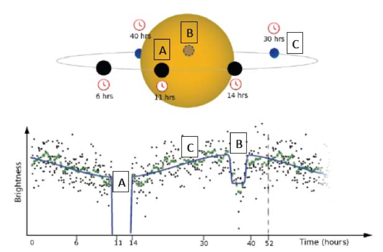 SchĂ©ma reprĂ©sentant l’orbite d’une exoplanète autour de son Ă©toile et la courbe de lumière en fonction du temps, basĂ© sur les observations de HAT-P-7B par la mission Kepler (Borucki et al. - Science 2009, 235, 709). CrĂ©dits : ESA