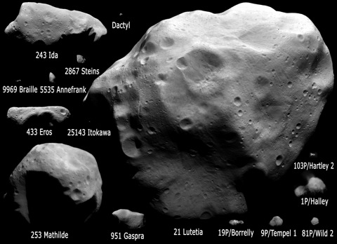 La figure montre toutes les images collectées par des missions spatiales durant des survols ou des visites dédiées à des astéroïdes et des comètes.