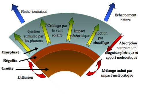 Tous ces éléments sur l’exosphère de Mercure ont donné lieu à de nombreux scénarios sur sa formation et son évolution. Par exemple, un des mécanismes les plus étudiés est lié à la magnétosphère de Mercure que peut dans des circonstances particulières pénétrer le vent solaire, induisant un criblage de sa surface par les protons solaires et l’éjection de particules neutres dans l’exosphère, produisant les maxima de densités observés sporadiquement à hautes latitudes (Potter et Morgan 1990). De la même manière, la rencontre entre Mercure et des événements énergétiques solaires ou un vent solaire particulièrement dense pourrait induire des modifications dans l’exosphère de Mercure observable depuis la terre (Potter et al., 1999 ; Killen et al. 2001). D’autres mécanismes de production de l’exosphère de Mercure seraient liés à la structure et composition de la surface de Mercure, notamment à la présence de larges structures topographiques comme le bassin Caloris (de diamètre, un demi rayon de Mercure) comme le suggère l’augmentation très significative du contenu total observé dans l’exosphère de Mercure lorsque ce bassin est à une heure locale matinale. Enfin l’évolution de l’exosphère de Mercure au cours d’une année (Leblanc et Johnson 2003 ; Killen et al. 2004) ainsi que la première et seule observation de l’exosphère de sodium par occultation solaire semblent indiquer le rôle très important de la migration des espèces volatiles du jour vers la nuit probablement essentiellement dû au gradient de température entre le jour (plus de 500 K) et la nuit (autour de 100 K).