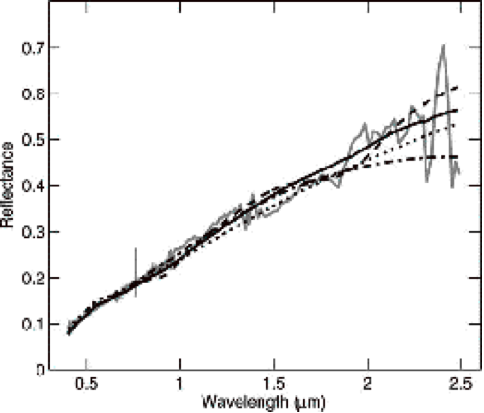 Les mesures jusqu’à 1 µm sont les observations résolues de Warell 2003, compositées avec un spectre historique de McCord et Clark (1979) sur tout le disque éclairé. Les courbes noires sont des ajustements menant à des estimations de composition différentes, très dépendantes de l’incertitude en NIR.