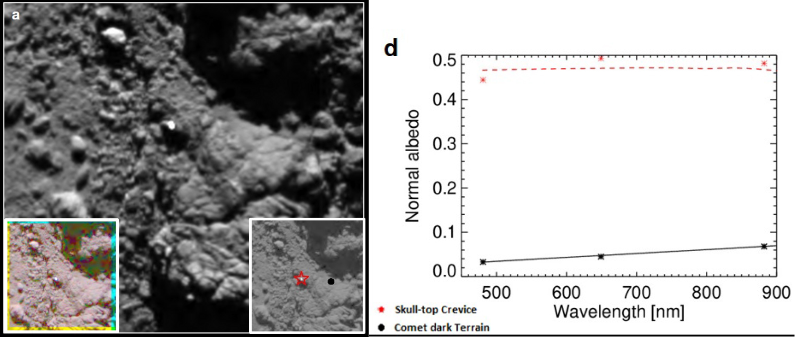 A gauche : Images prise par la caméra NAC d’OSIRIS le 14 juin 2016 à 10:29 UT montrant la glace d’eau brillante sur le 2e site d’atterrissage. Les images en bas montrent une vue en couleur (à gauche), et une image avec les symboles (étoile rouge pour la surface brillante, cercle noir pour le terrain sombre de la comète) utilisés pour le graphique de droite. A droite : albédo mesuré pour la surface brillante avec le modèle de composition (ligne pointillée) indiquant une abondance en glace d’eau de 46%).