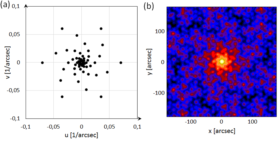Les 30 collimateurs de STIX (détecteur et paire de grille) permettent donc de mesurer 30 points dans le plan de Fourier. L’échantillonnage du plan de Fourier par STIX (a) et la réponse brute de l’instrument à une source ponctuelle (b) sont montrés dans la figure ci-dessous.