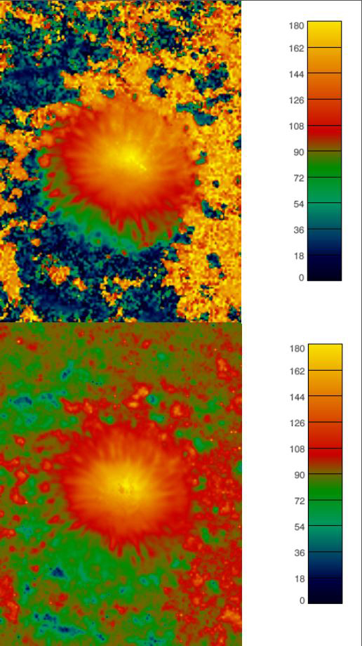 Figure du bas : résultat de la modélisation dans l’hypothèse d’un champ magnétique homogène (tiré de http://jsoc.stanford.edu/ajax/lookdata.html).