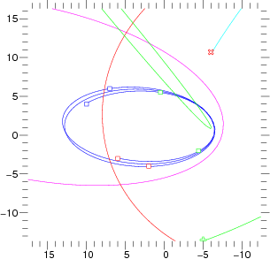 Simulation de mesure par GRAVITY de l’orbite (en bleu) d’une étoile très proche du trou noir centrale. L’étoile hypothétique utilisée ici est semblable à S2 mais 10 fois plus proche du trou noir. On pense découvrir de telles étoiles grâce à GRAVITY. L’orbite ne se referme pas : c’est l’effet relativiste d’avancée du périapse. Les symboles de couleur représentent les positions mesurées par GRAVITY en mai, juin et juillet, deux années consécutives. L’étoile a déjà parcouru deux fois son orbite et l’avancée du périapse est évident. Les autres courbes représentent des fragments d’orbites d’autres étoiles également observées par GRAVITY. Les axes sont gradués en milliseconde d’angle (mas), la résolution de GRAVITY étant de 2 à 4 mas.