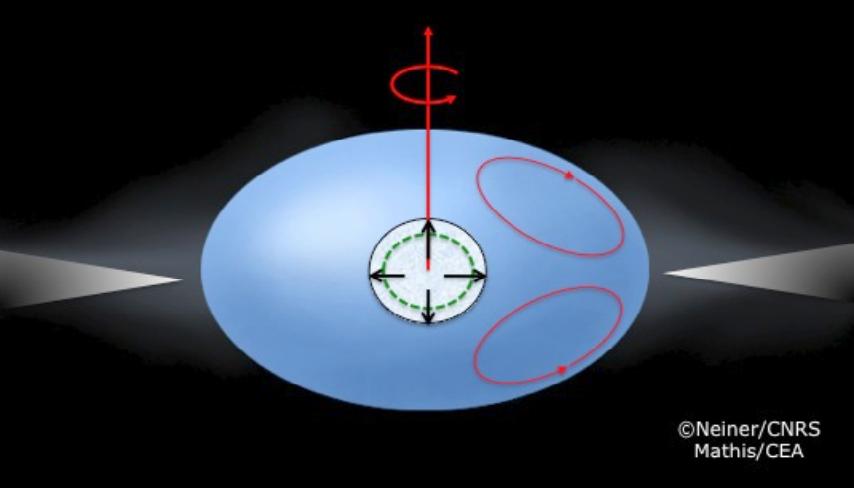 Différents types d’oscillations se propagent dans les intérieurs stellaires : les ondes acoustiques dues à la compressibilité du milieu et les ondes de gravité dues à la force d’Archimède. Dans le cas des deux étoiles Be tardives étudiées ici, ce sont les ondes de gravité, fortement influencées par la rotation rapide (on les appelle alors ondes gravito-inertielles) qui permettent de sonder la structure interne jusqu’au coeur nucléaire. C’est alors que la surprise intervient : en comparant le spectre des oscillations observé par le satellite CoRoT au calcul théorique des fréquences, on comprend que ce coeur convectif est 1,25 plus lourd et 1,2 fois plus étendu que ce qui est prédit par les modèles statiques dits standards des étoiles où la dynamique interne, en particulier la rotation, n’est pas prise en compte.