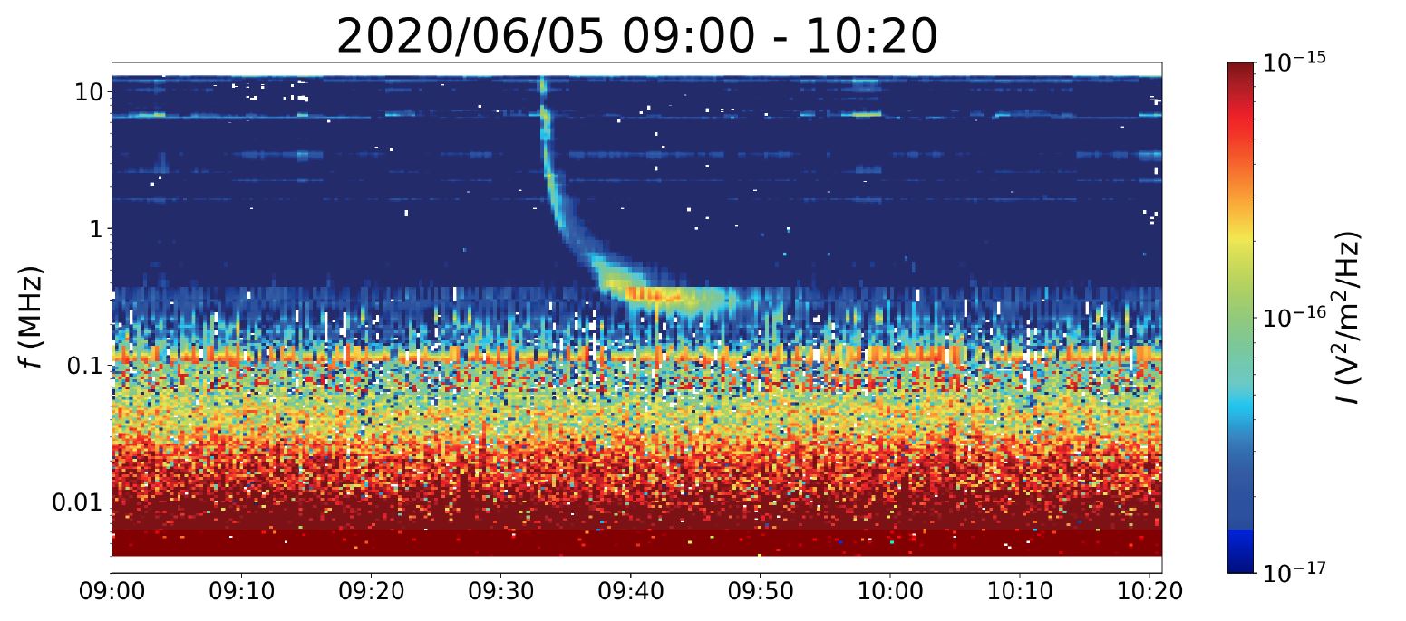 La figure ci-dessous montre un des tout premiers Type III observés par RPW, le 6 MaI 2020. A cette période, Solar Orbiter était déjà situé à la moitié de la distance Soleil-Terre. Le sursaut observé commence vers 09:33 UT, lorsque les électrons énergétiques sont encore dans l’atmosphère externe du Soleil et s’arrêtent vers 09:47 UT, lorsque les électrons ont parcouru de l’ordre de 40 rayons solaires.